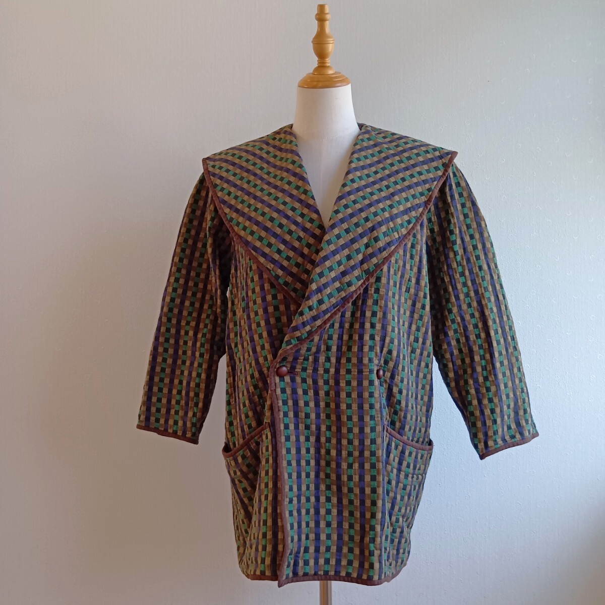 - ヨーガンレール ビッグカラーコート チェック 綿100% グリーン パープル ブラウン