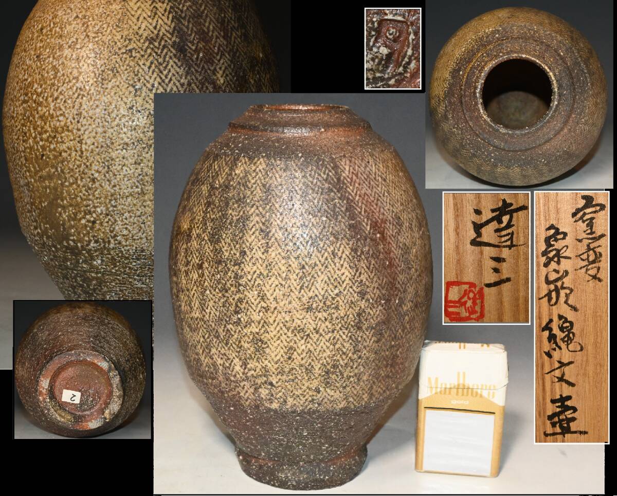 > 真贋保証■人間国宝 島岡達三 造■ 窯変象嵌縄文壷 未使用 共箱 高約24.6cm 花瓶 花器 飾壷 益子焼 民芸 民藝 茶道具 浜田庄司に師事