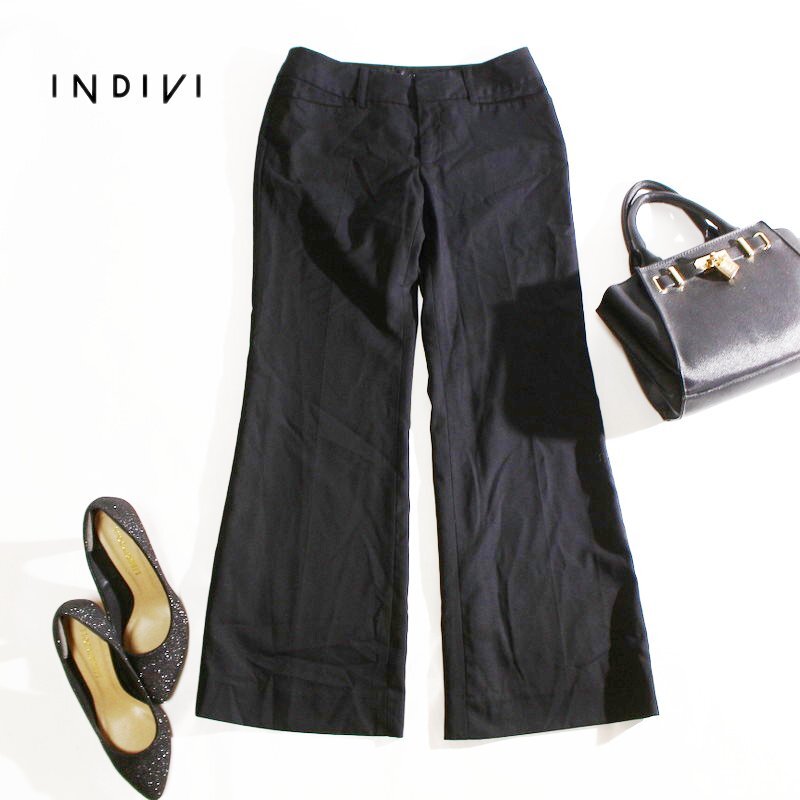 > 美品 インディヴィ INDIVI 株) ワールド 毛50% 定番 スーツ パンツ 7号 36 ブラック 黒 フォーマル ビジネス ストレッチ 定番