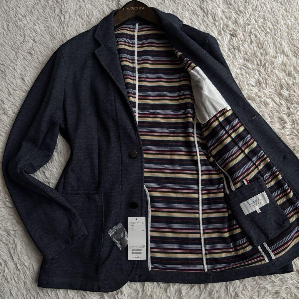 > (極美品/XLサイズ) BEAMS テーラードジャケット ストレッチ メタルボタン アンコン パイピング ボーダー ビームスライツ ネイビー ブレザー