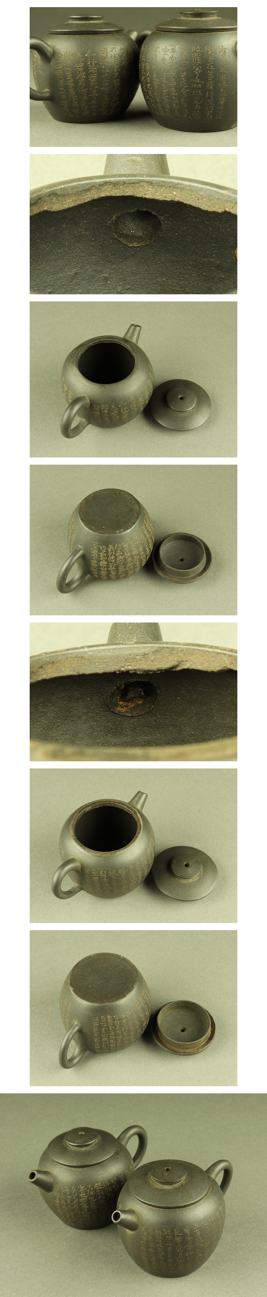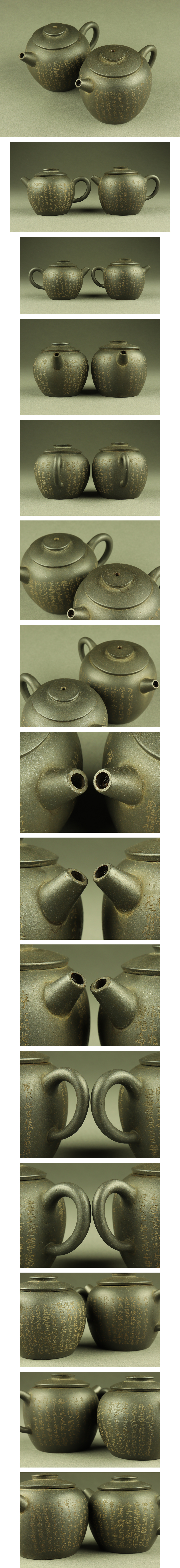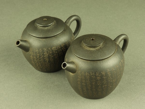 - 【宇】JA024 唐物 漢詩彫 黒泥急須 一対 単孔口 煎茶道具