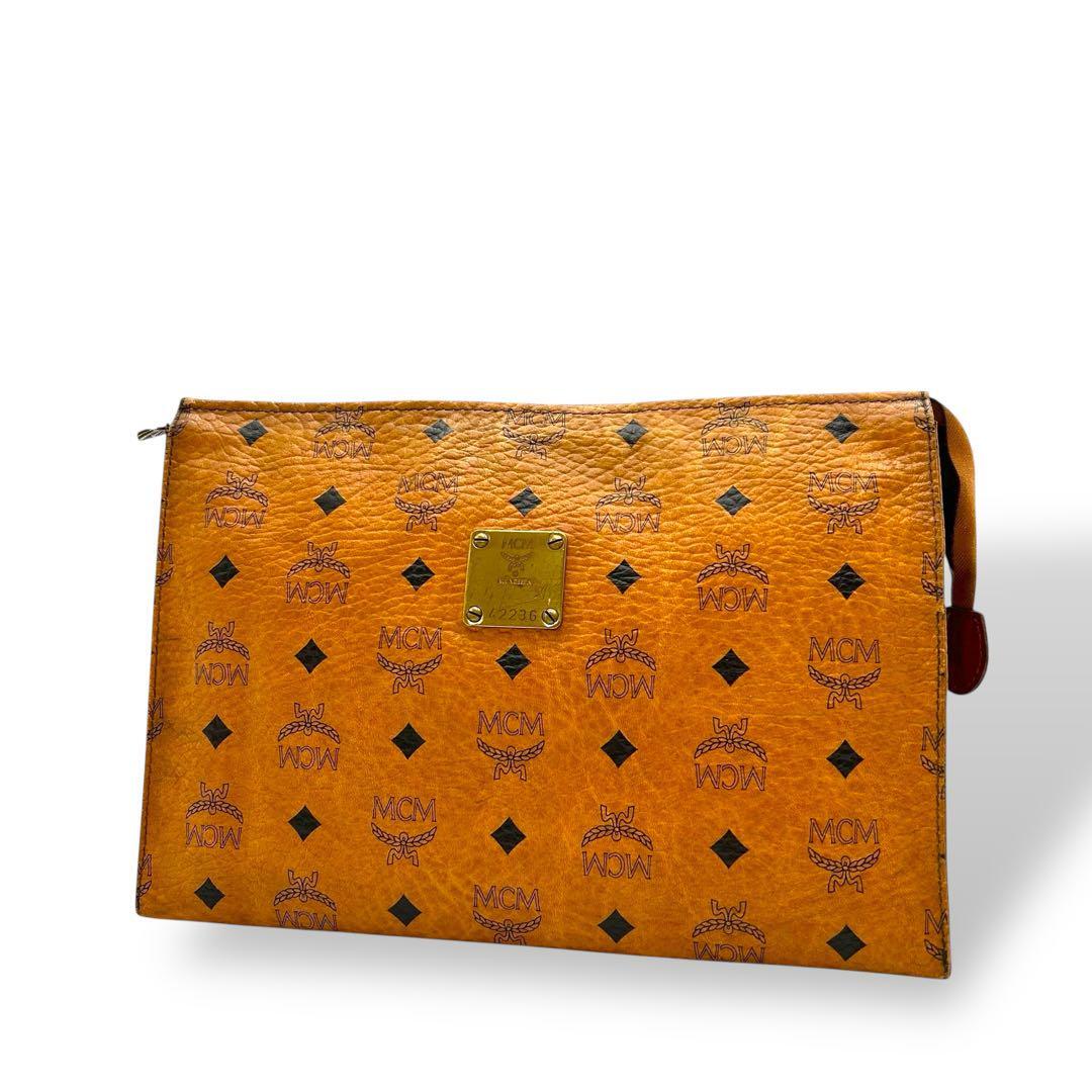 - 【人気】MCM エムシーエム クラッチバッグ レザー プレートロゴ ブラウン 総柄 ゴールドプレート 希少