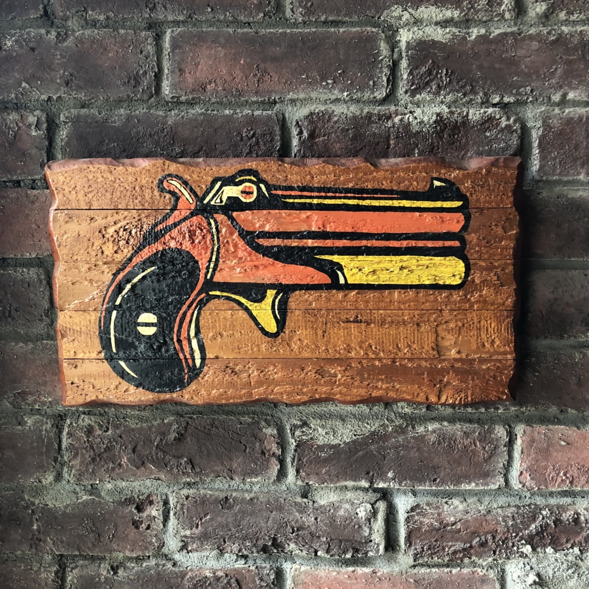 ブラウンカラーの木を組み合わせて1枚の板にし、レトロポップな雰囲気のピストルのイラストを施した商品です。
