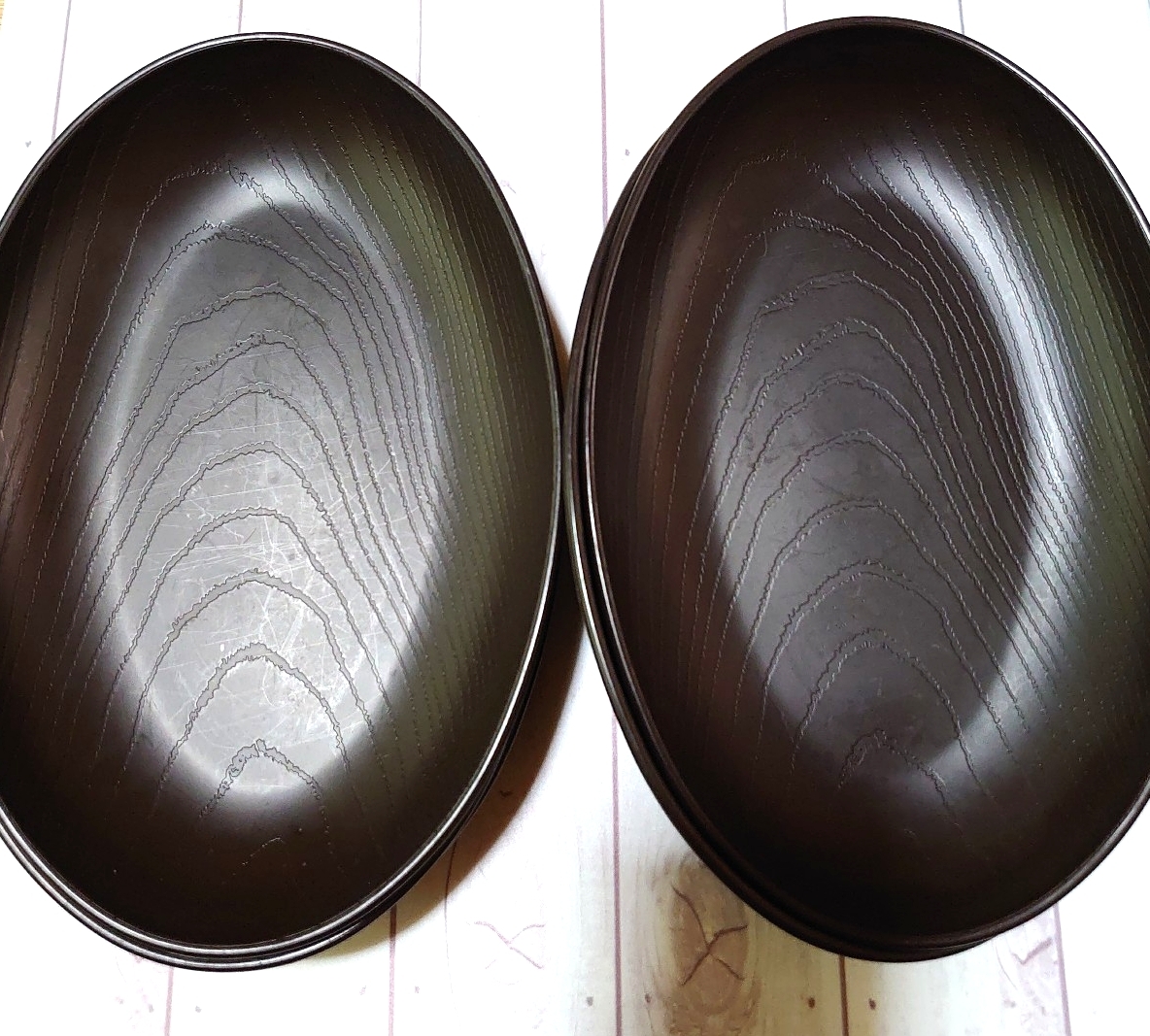 - 木目模様の軽いオーバルプレート〜楕円形6枚セット USED 茶色 食器 皿 アウトドア 取り皿