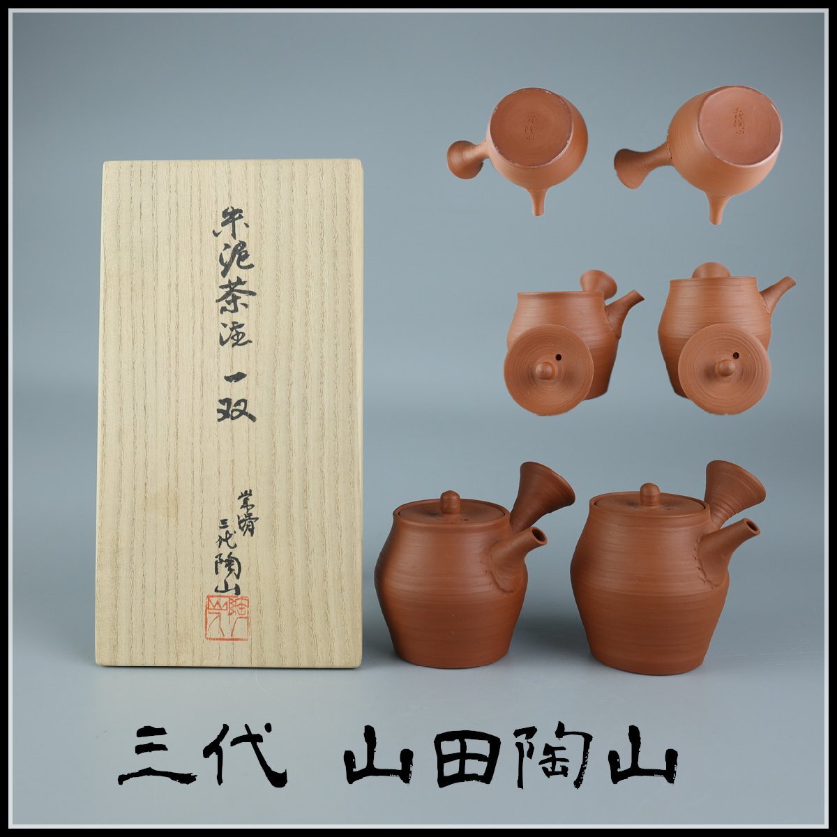 【志】K1278 急須 一双 三代 山田陶山作 朱泥 常滑焼 茶道具 茶注 共箱
