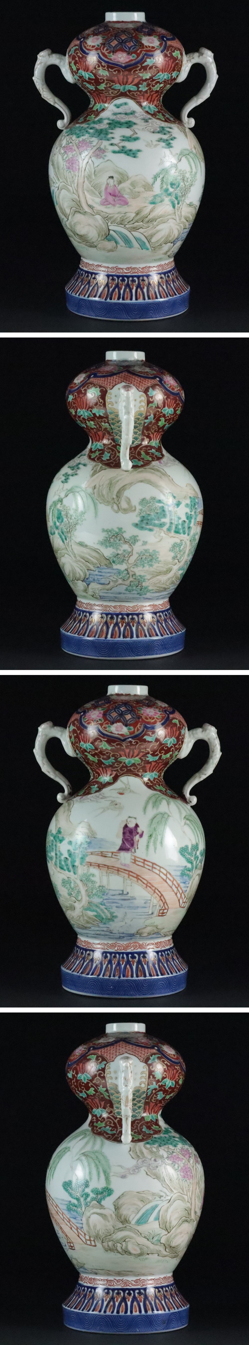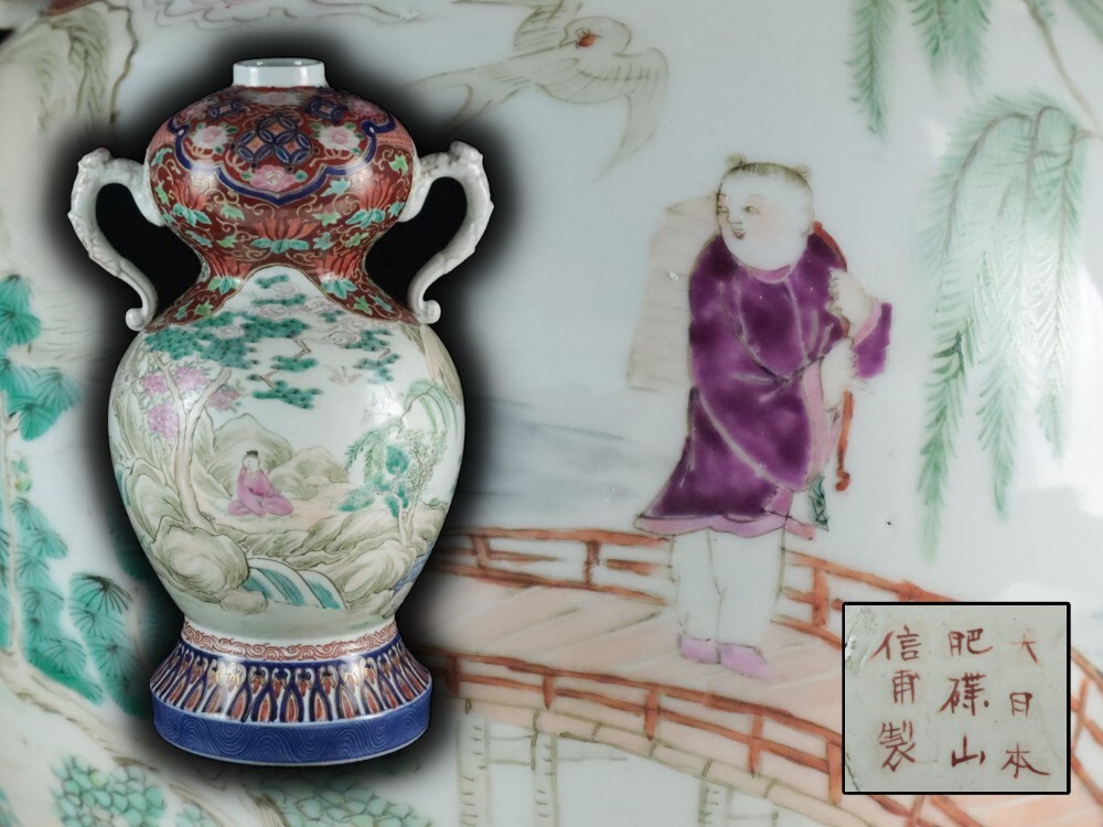 > 明治時代 / 大日本 肥蝶山 信甫製 田代紋左衛門 / 色絵 唐草花七宝紋 瑞雲 唐子 人物風景図 菊花耳 花瓶 / 花器 花入 飾壺 飾壷 / 高さ36cm