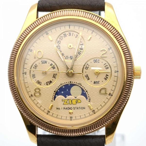 > ZIP FM ムーンフェイズ トリプルカレンダー クォーツ ゴールド文字盤 アナログ 3針 メンズ 腕時計 中古 ◆2008