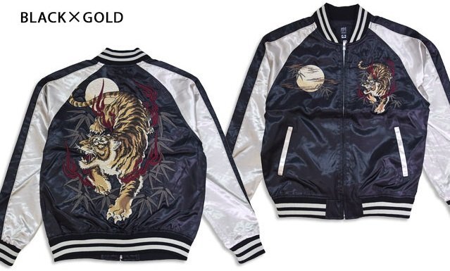 > サテンスカジャン「虎」◆朧 ブラック×ゴールド XLサイズ 9053811 和柄 和風 おぼろ トラ タイガー 刺繍 スーベニアジャケット