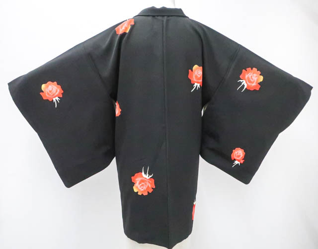 - 《古美術京松》リサイクル着物 黒羽織 昭和レトロ 薔薇文 羽織紐付 正絹 身丈85cm 裄丈約64cm kyo7z06-719