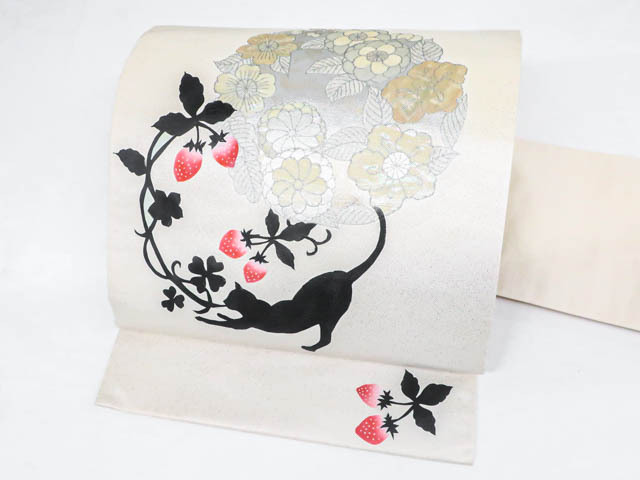 - 《古美術京松》リサイクル着物 九寸名古屋帯 オリジナル 太鼓柄 猫に苺 正絹 kyo7b08-168