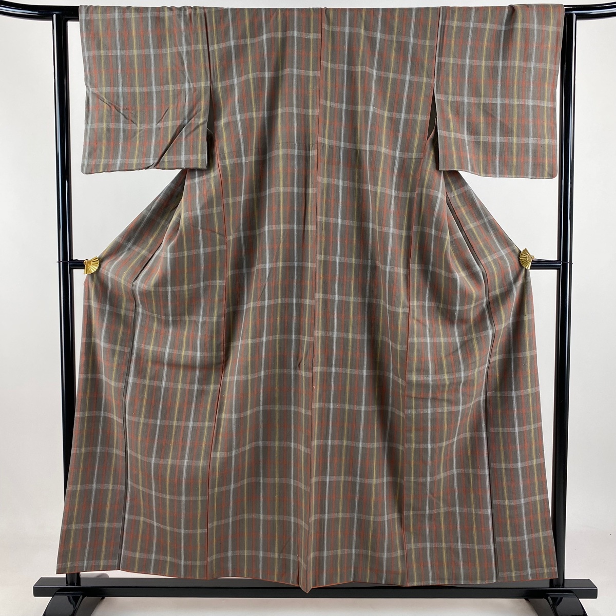 - 【美品】 紬 身丈155cm 裄丈62cm S 袷 紬地 格子 灰茶 正絹 名品 【中古】