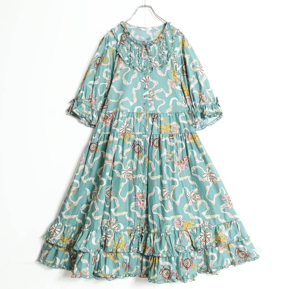 > 【極美品】ピンクハウス★2024年製!ゆったりフォルム♪前開きローンワンピース 薄緑系 フリル&リボン♪紋章柄♪z15636