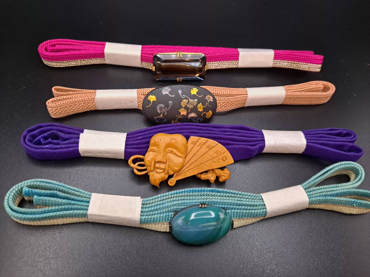- 【12】アンティーク・ヴィンテージ黒曜石?「翁と扇」意匠黄楊・「銀杏」象嵌・青瑪瑙帯留め 帯締め三分紐付4点セット