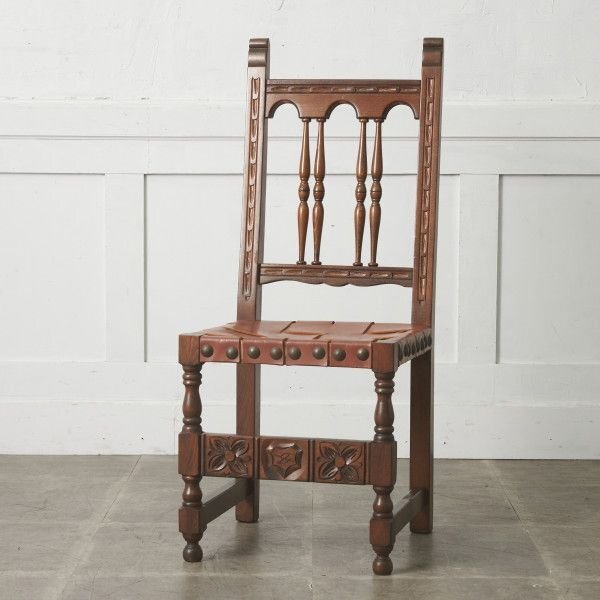 - IZ95084N★スペイン ヴィンテージ ダイニングチェア 本革 木彫刻 ビーチ 無垢材 椅子 木製 鋲打ち ハイバック サイドチェア クラシック