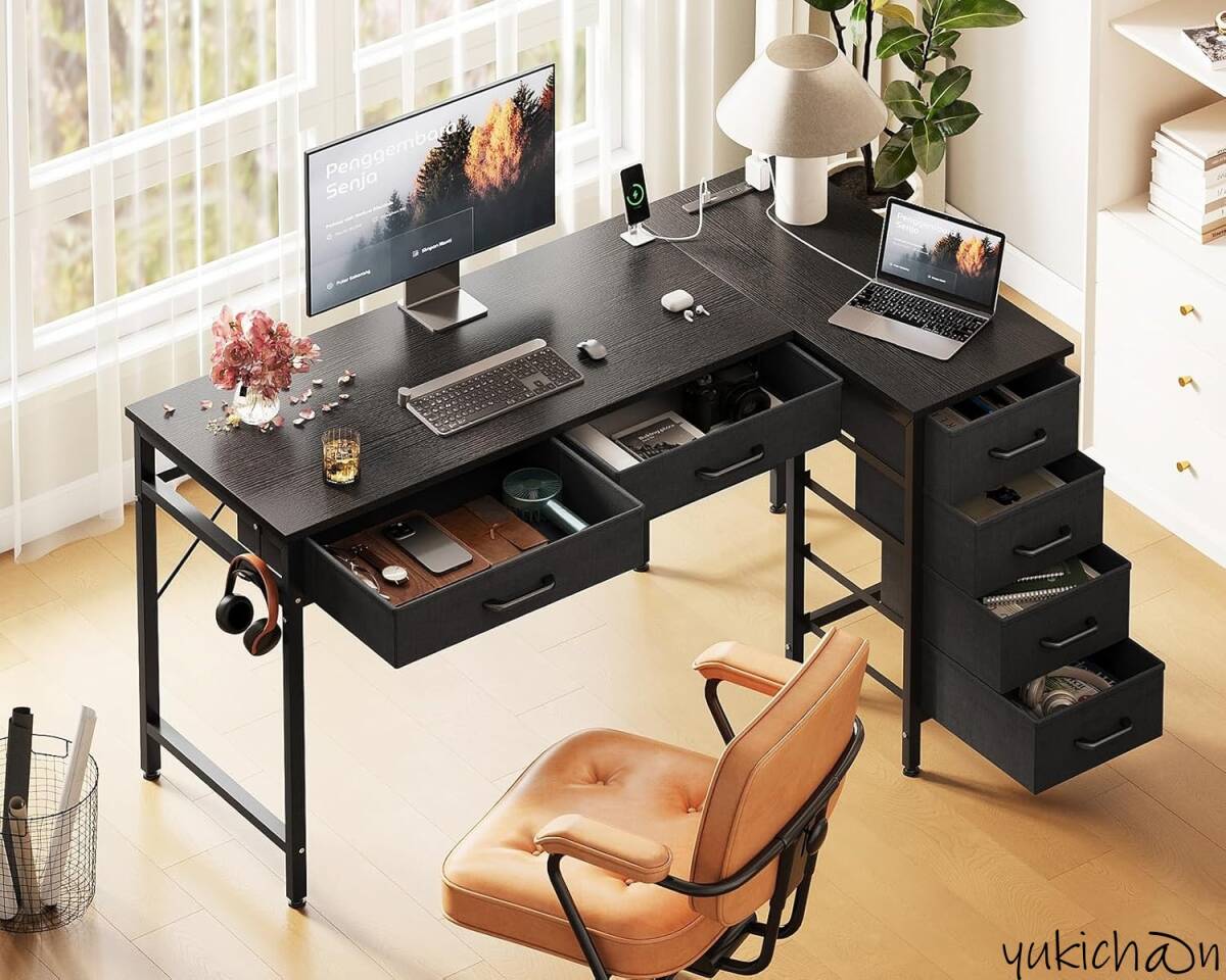 > L字デスク パソコンデスク ゲーミングデスク ブラック コンセント 右棚左棚 引き出し 幅126cm 多層収納 頑丈フレーム 組立簡単 在宅勤務