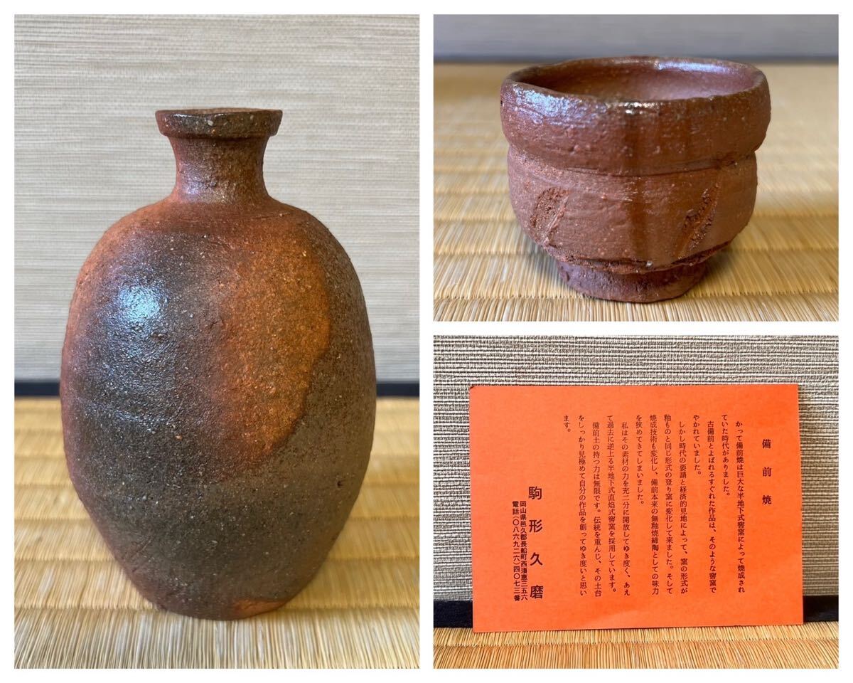 - 【 備前酒器揃 駒形久磨造】備前焼徳利酒呑一対揃い 駒形久磨造 在銘 栞 物故作家 独創的人気作家 備前焼締酒器 備前練込酒器 保証品