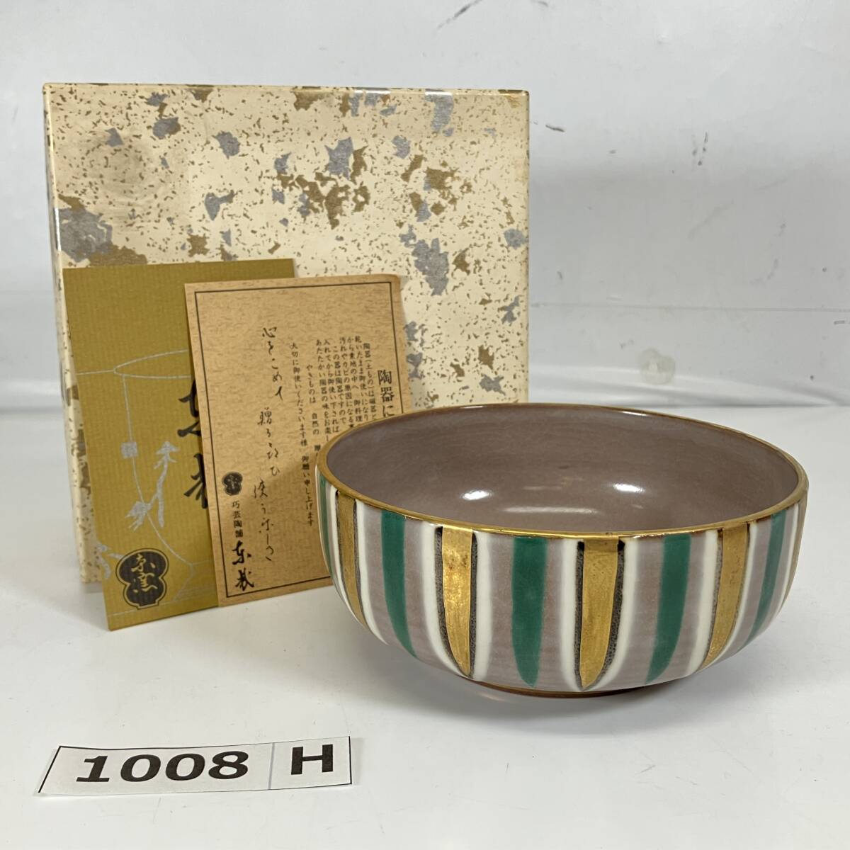 - (志)【未使用】清水焼 音羽窯 東哉 金彩 貫入 彩棒縞 鉢 深鉢 盛り鉢 菓子器 箱/栞 金縁 和食器 会席料理 (I)1008H