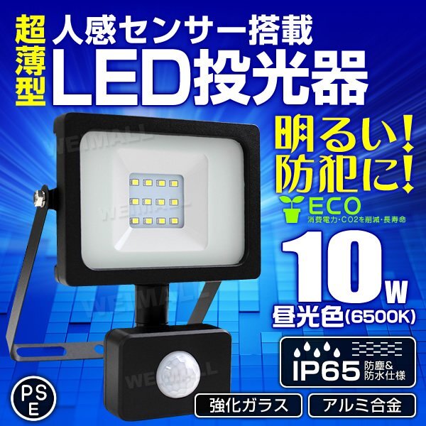 - 【PSE取得済】新品 LED投光器 10W 昼光色 6500K 人感センサー付き 3mコード AC100V対応 薄型 広角 作業灯 防犯 夜間 照明 ライト