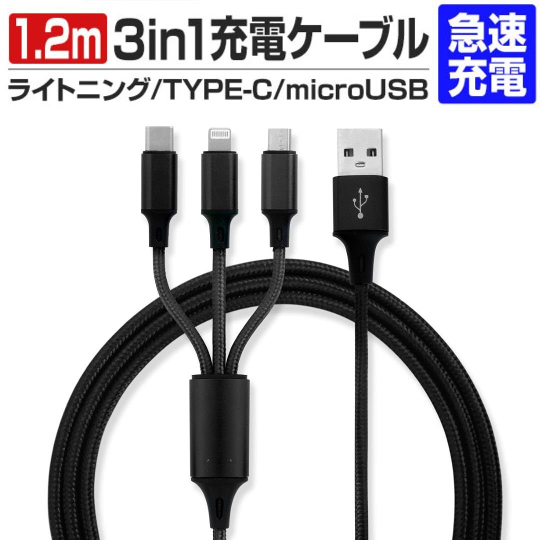 - 【ブラック】3in1 充電ケーブル 1.2m iPhone Type-C MicroUSB 急速充電2.1A Android 3台同時充電 高耐久コード iPad ワイヤレスイヤホン
