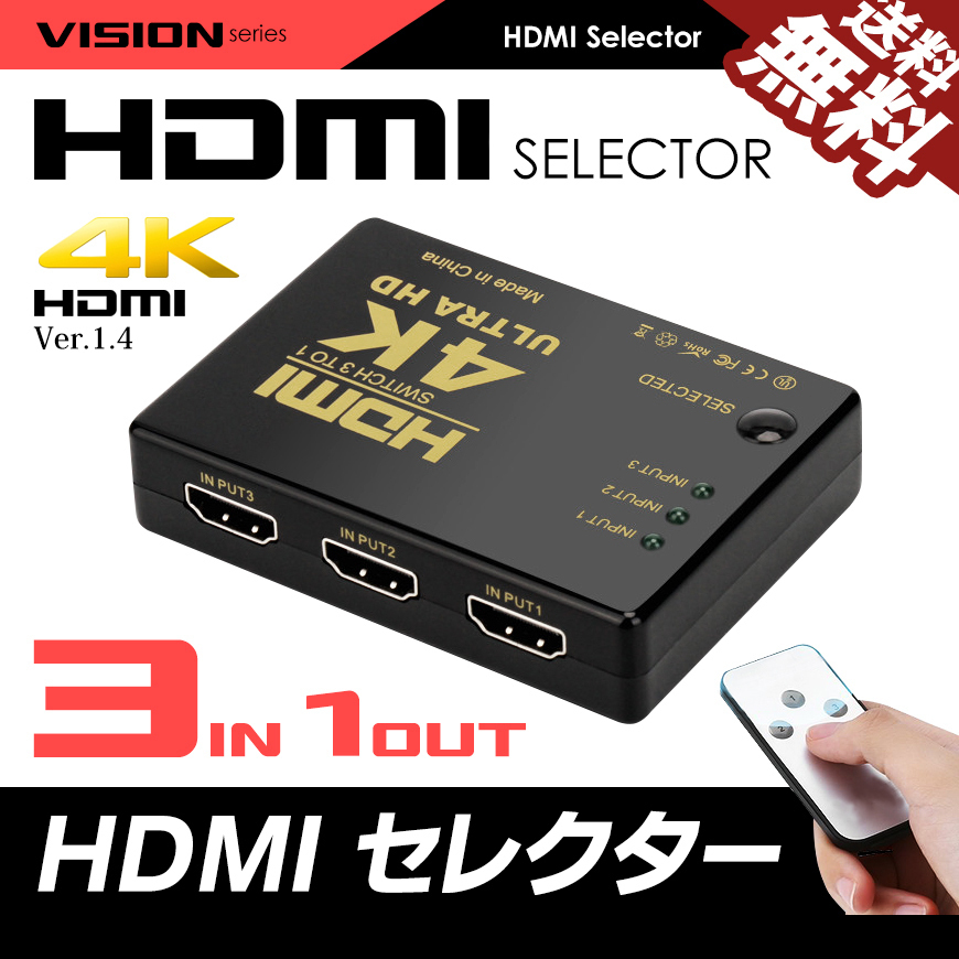 - 4K HDMIセレクター HDMI切替器 入力3端子 出力1端子 リモコン付 フルHD 国内検査 ネコポス 送料無料
