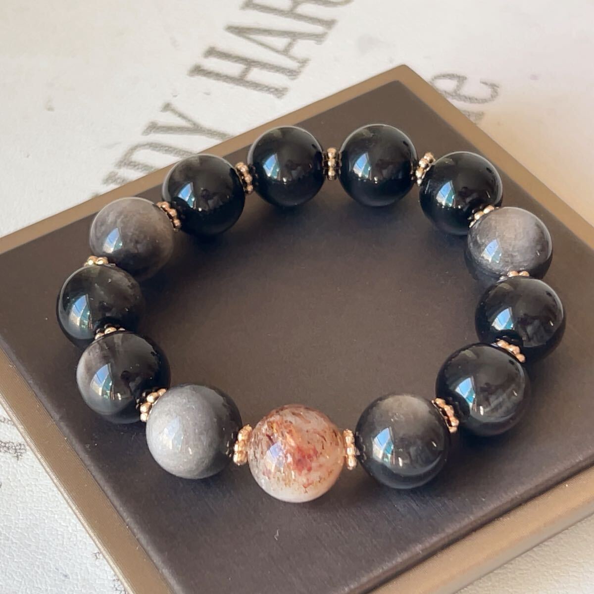 - ◇シルバーオブシディアン(黒曜石)+ブラックゴールドスーパーセブン1粒◇ブレスレット◇キャッツアイ効果◇パワーストーン◇038B10904