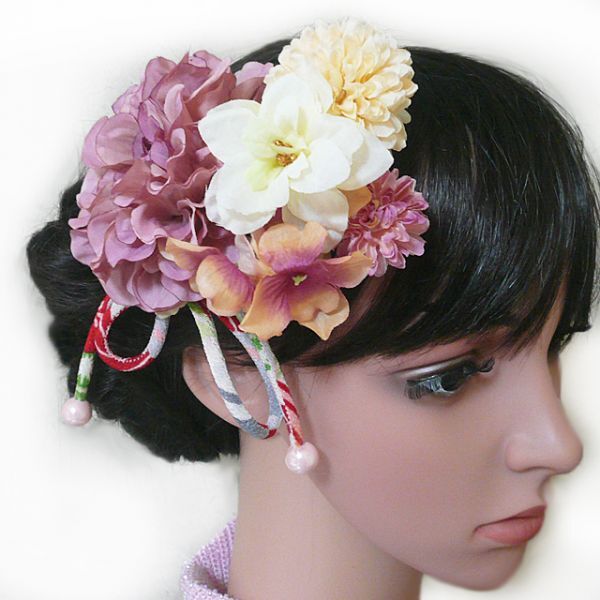 - 髪飾り 花 ダリアmoと小花 ピンク 和柄紐付き 成人式 振袖 結婚式 卒業式 袴 浴衣 着物 くすみ系(1)