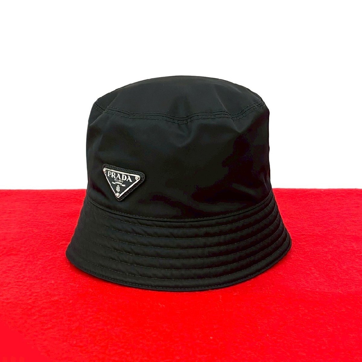 - 極 美品 PRADA プラダ Re-Nylon リナイロン 三角ロゴ プレート 金具 ナイロン バケットハット 帽子 Mサイズ ブラック 75948
