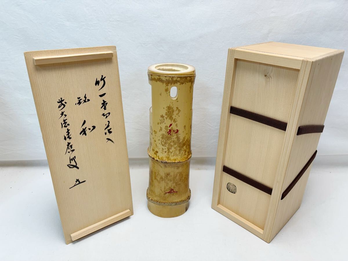 > M704373 華道具 高野宗竹作 竹一重切花入 竹おとし 前大徳 宝林寺 福本積應和尚 花押 銘: 和 掛置兼用 竹工芸 天然竹製 生花 茶室 共箱
