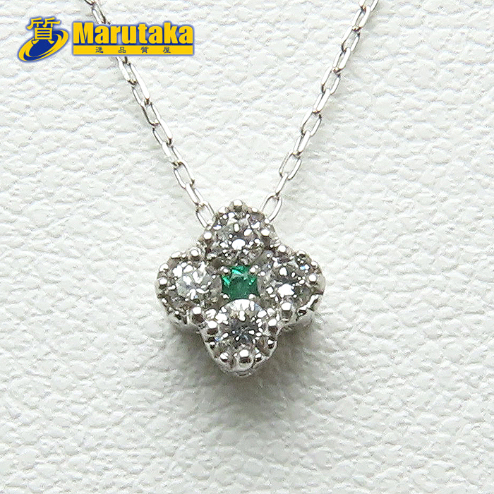 > 【 K18WG ネックレス 】ホワイトゴールド エメラルド 0.01 ダイヤモンド 0.08ct 40cm フワラー 中古 71-0009
