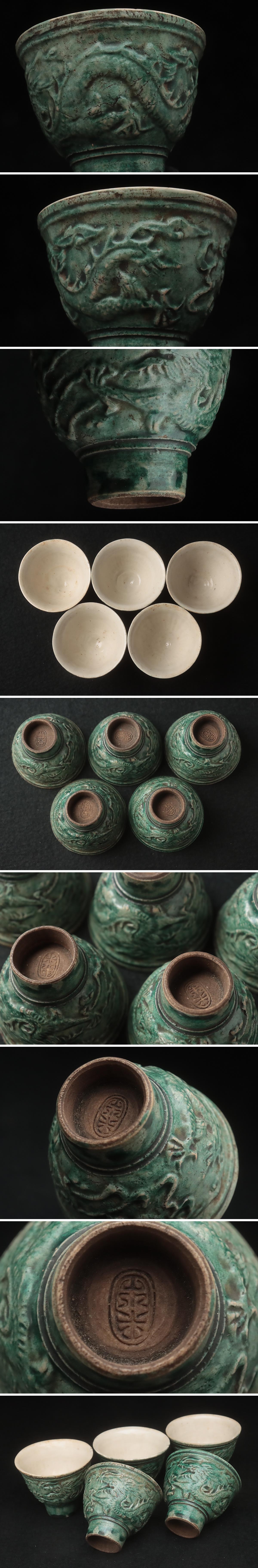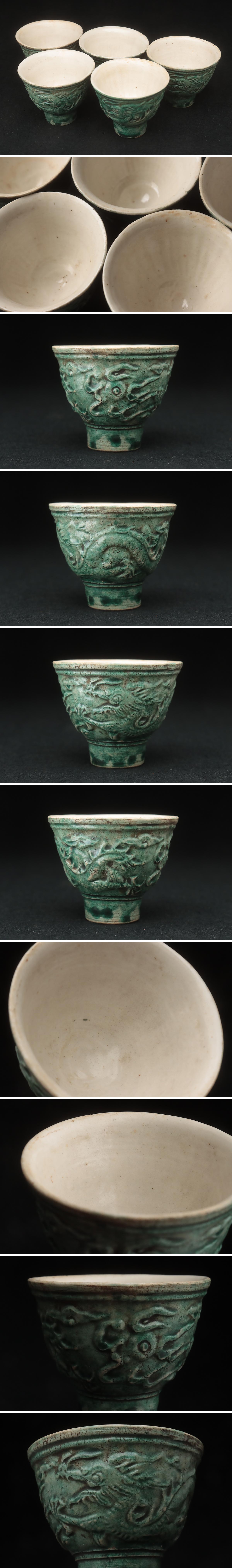 - FD083 時代【名工 青木木米 造】緑釉 陽刻 珠追龍図 茶碗・煎茶碗 五客・茶杯 茶具 茶器 煎茶道具 古美術
