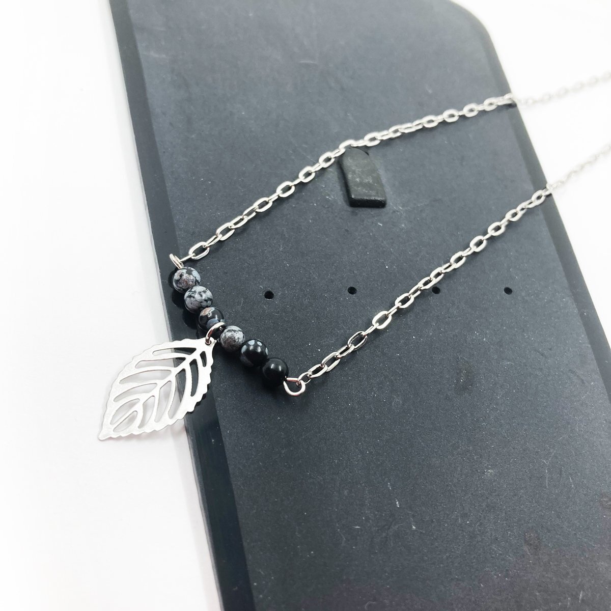 - 透かしリーフチャーム パワストーンステンレス スノーフレークオブシディアン 約4mm玉 ネックレス 2.5mm幅45cm ST80