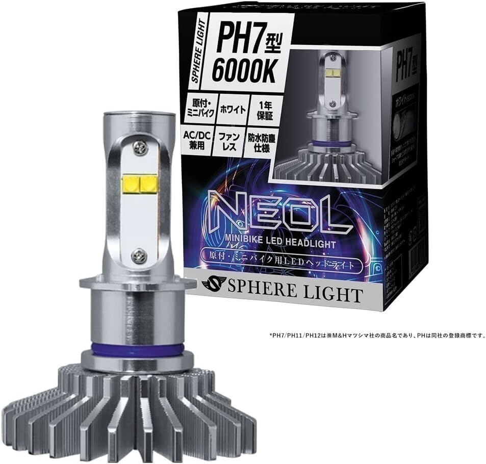 > スフィアライト NEOL PH7型 6000K ミニバイク用 LED ヘッドライト DC/AC兼用 6000K ホワイト 2600lm / 2000lm 1年保証 SBNR060