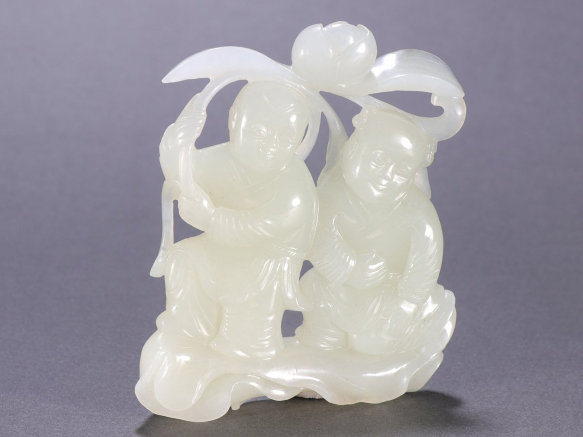- 【安】清時代 和田玉 白玉 合歓童子紋彫り件 極細工 古置物 古擺件 中国古美術 古美味 時代物 古董品 199