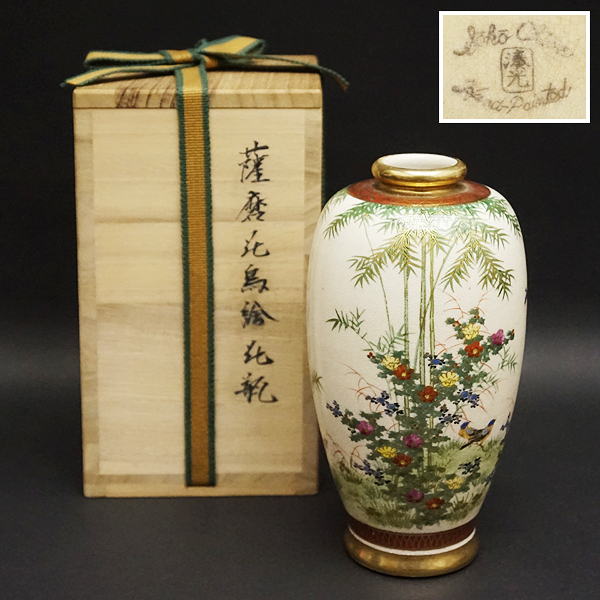 - 薩摩焼 湊光銘 手描花鳥図文 花瓶 花生 花器 飾壷 陶芸 陶器 陶製 陶磁 時代 飾壷 飾瓶 骨董 工藝 工芸 茶道具 煎茶道具 色絵磁器 古美術品