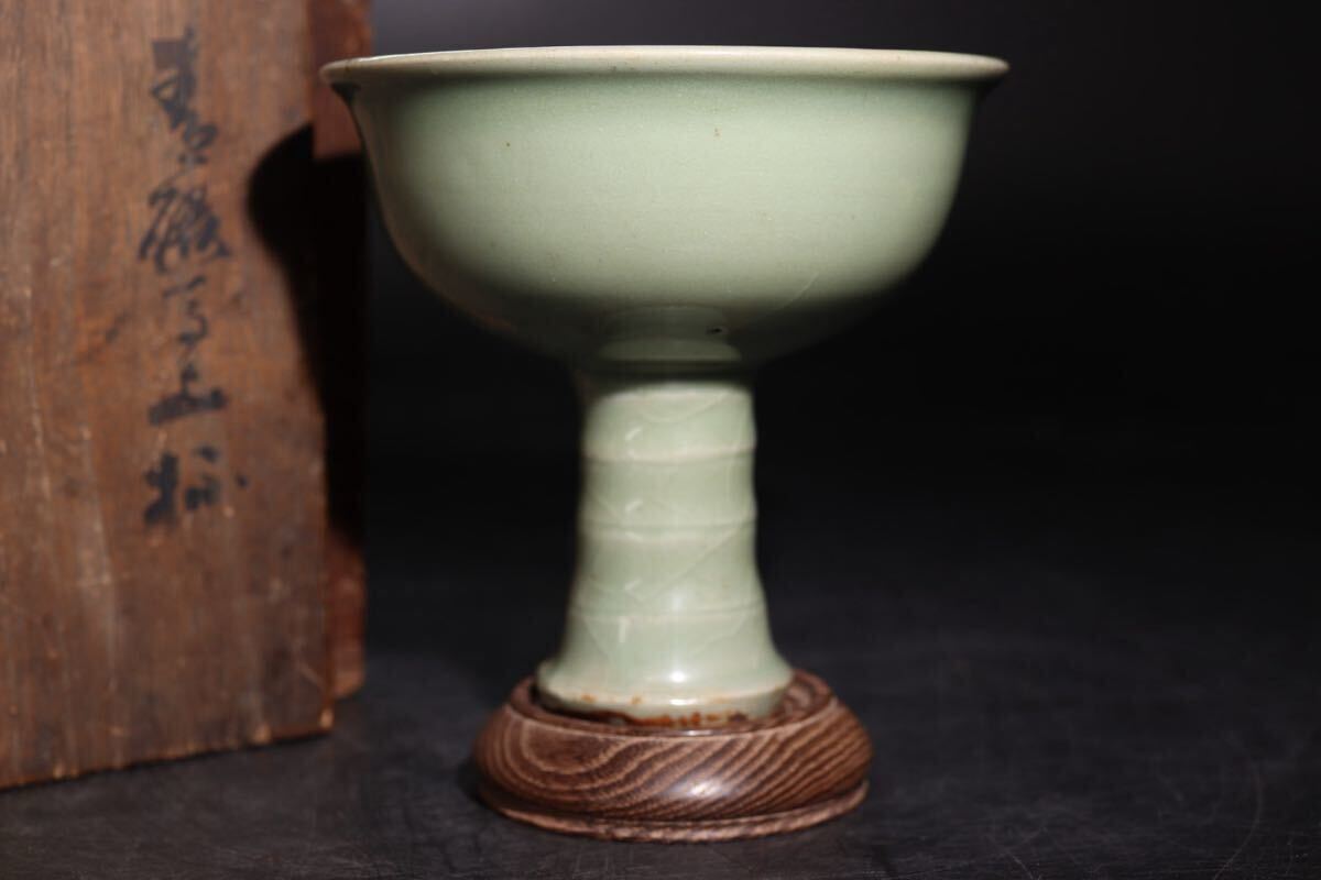- 時代 青磁 高足杯 金継ぎ 台座 木箱付 / 中国美術 酒器 酒杯 盃 茶器 煎茶道具 検索: 龍泉窯 天龍寺 .G2767