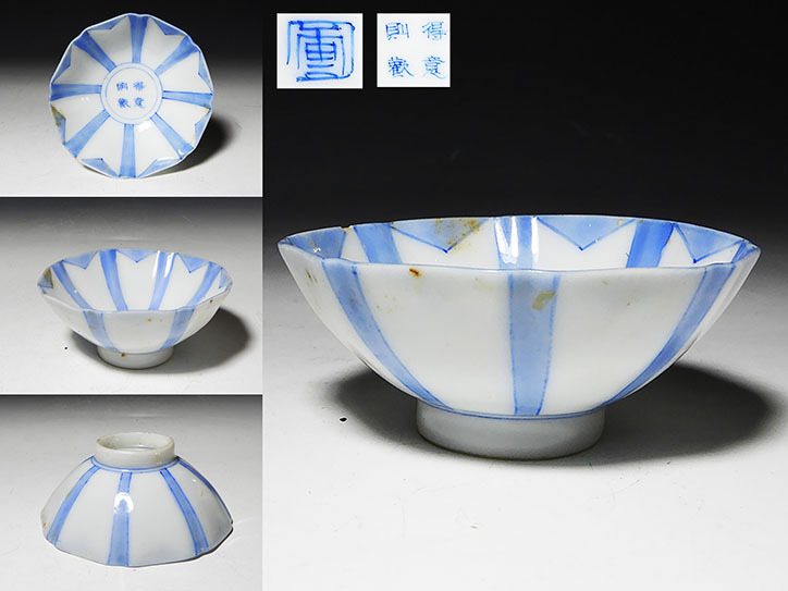 - 【桃】酒器ぐい呑み:瀬戸染付矢羽根図極薄猪口 在銘