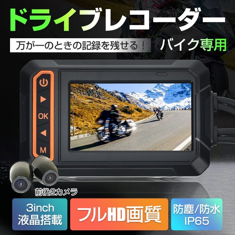 - 送料無料 ドライブレコーダー バイク 前後カメラ IP65防水 3インチ 150°広角 Gセンサー 録画 バッテリー給電 ツーリング あおり運転 ee356