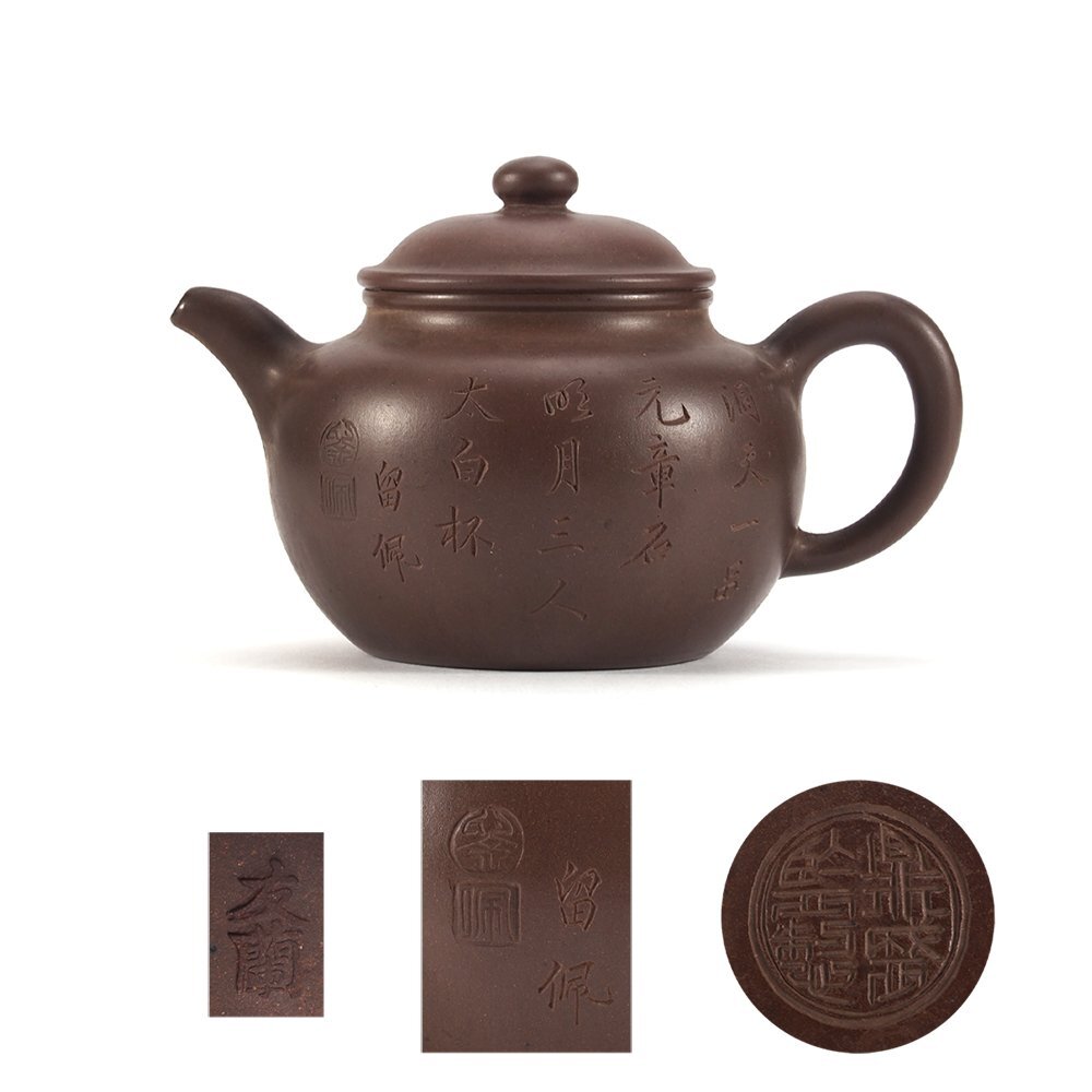 - 【夢工房】唐物 紫泥 「 鼎盛監製 」 底款 「 友蘭 」 蓋裏印 邵景南 留佩 漢詩彫 急須 ( 朱泥 紫砂 壷 煎茶 中国 )長幅15.2㎝ 2B-733