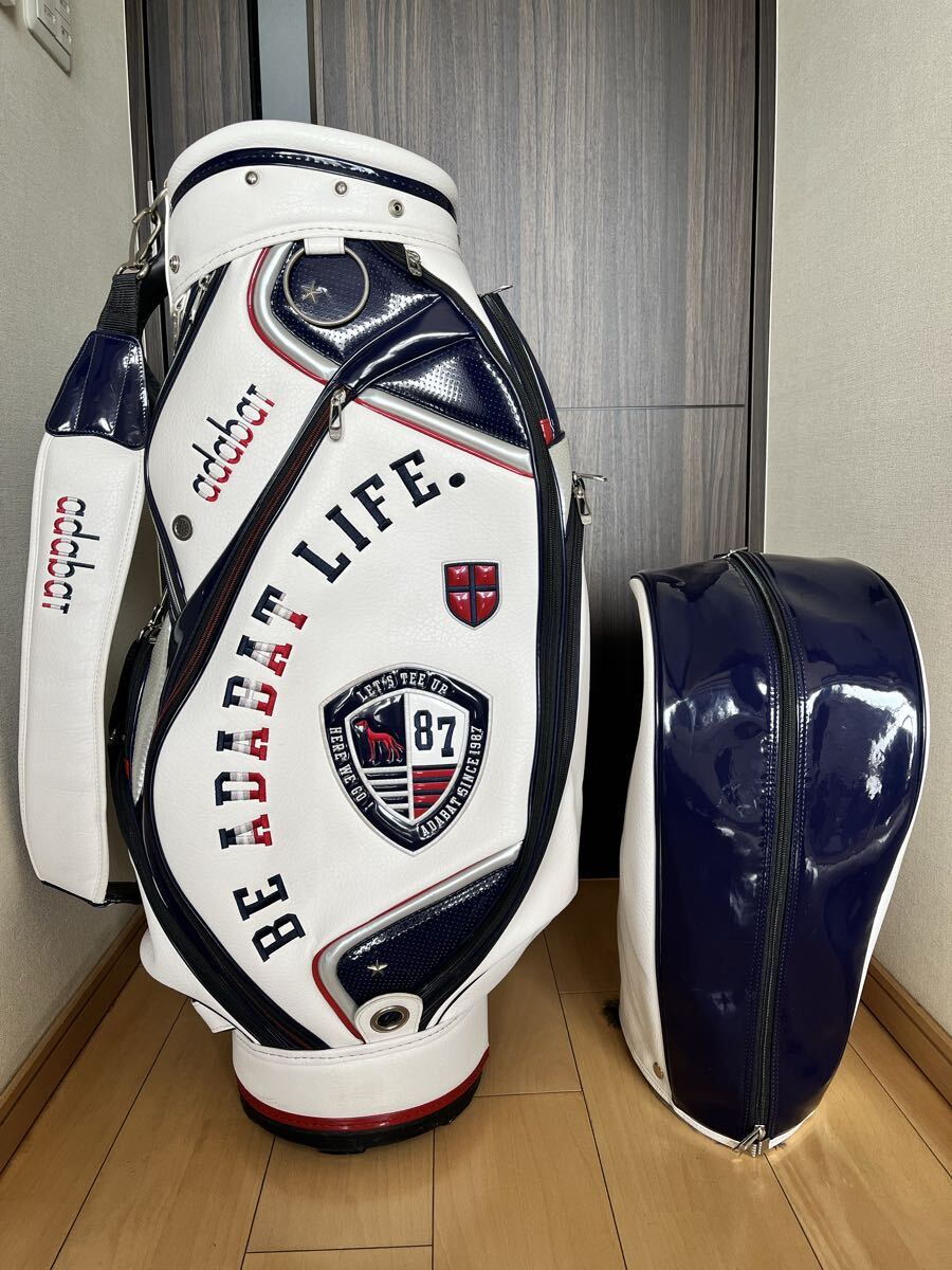 - 美品adabat アダバット カートキャディバッグ ホワイト/ネイビー レザー調 エナメル キャディーバック GOLF
