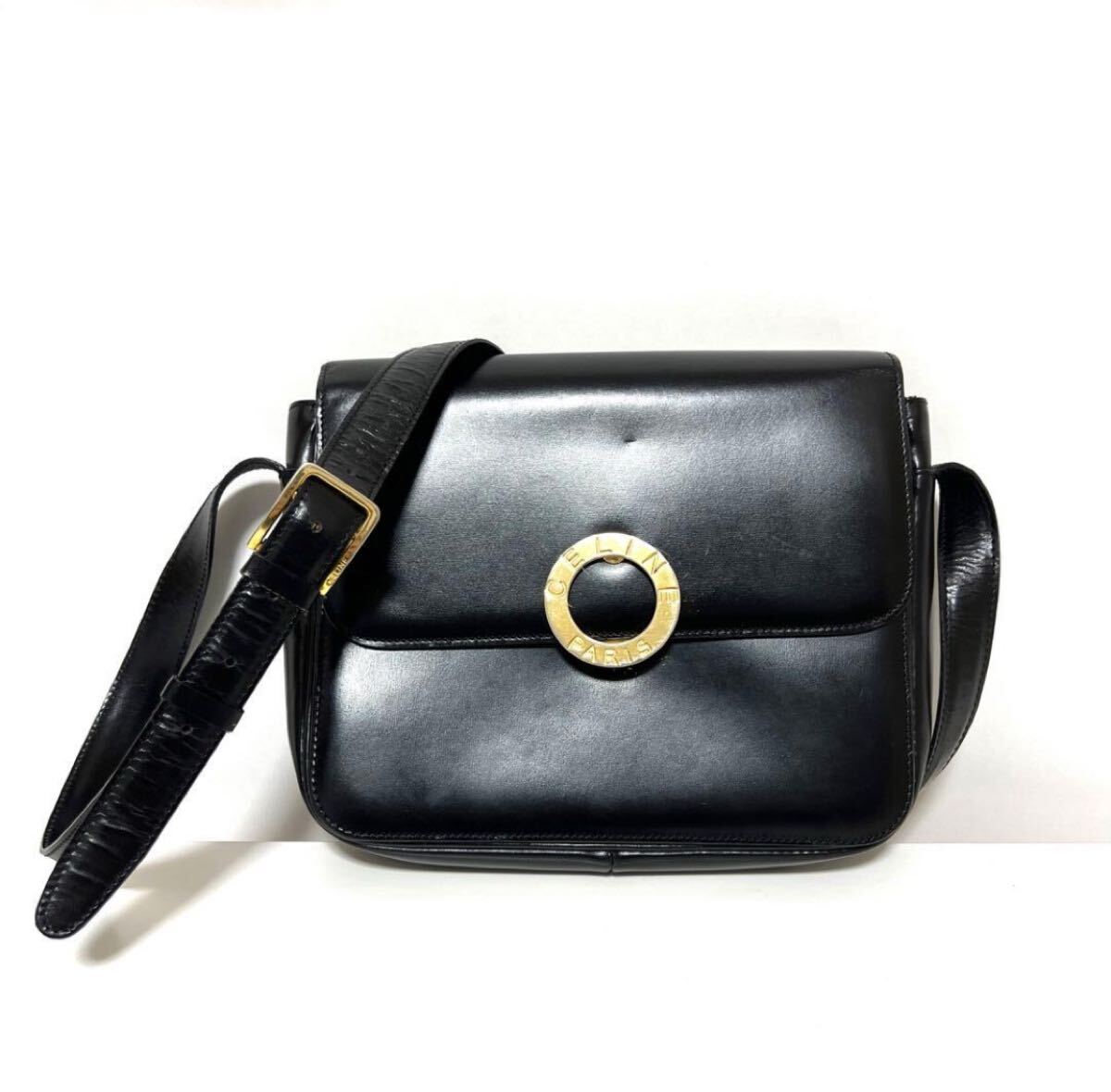 - CELINE オールド セリーヌ ショルダーバッグ サークルロゴ ヴィンテージ ブラック カーフレザー 肩掛け 中古