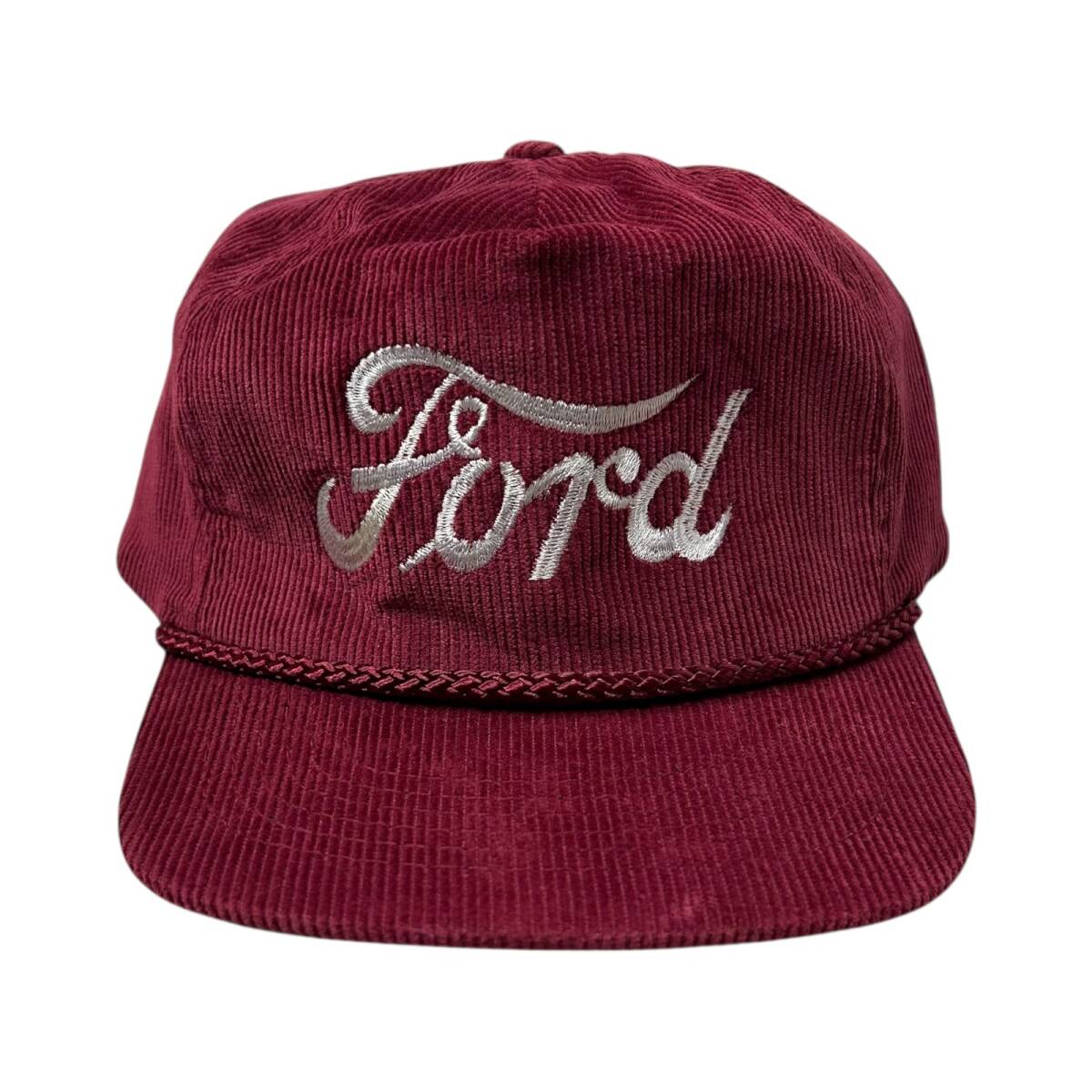 - 90s フォード 企業 スクリプト ロゴ コーデュロイ スナップバック キャップ サイズ フリー マルーン バーガンディ