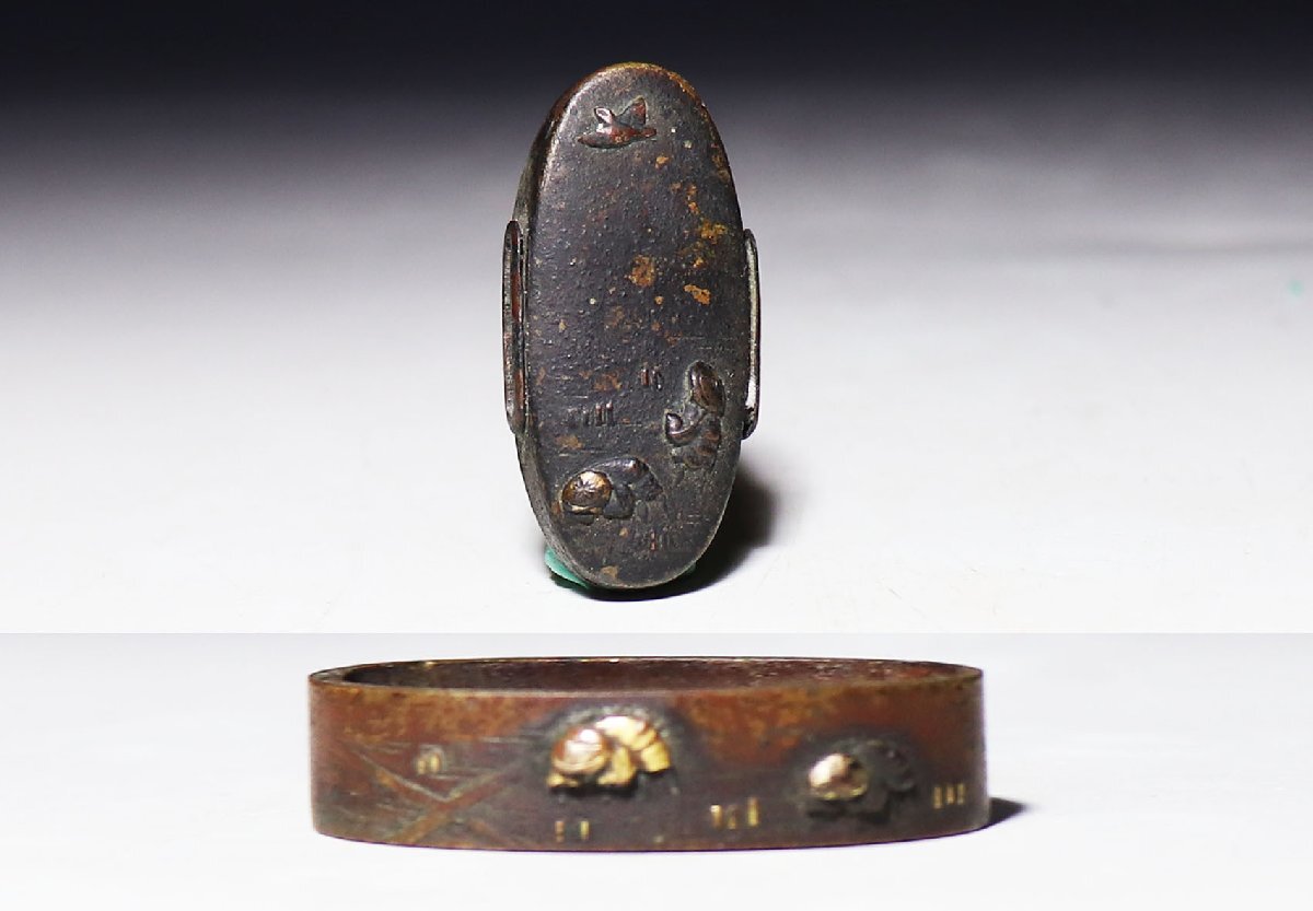 - 【桃】刀装具:金工銅地銀象嵌蓑亀図片目貫