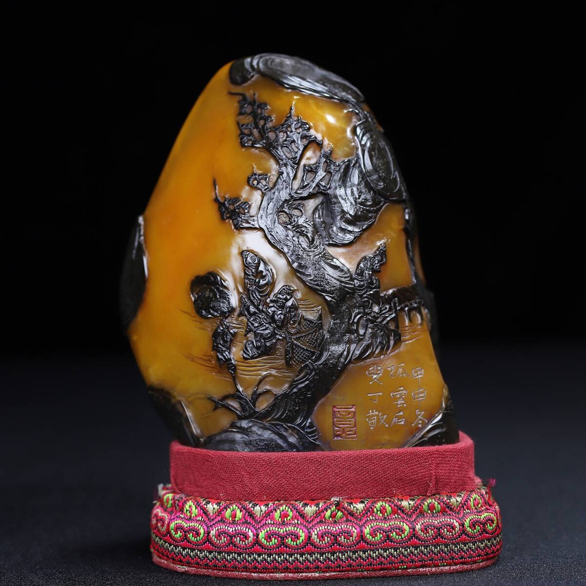 - 旧 清代 寿山石 烏鴉皮 彫刻 松下論道 山水人物置物 文房具 中国古美術 古賞物 唐物 S710