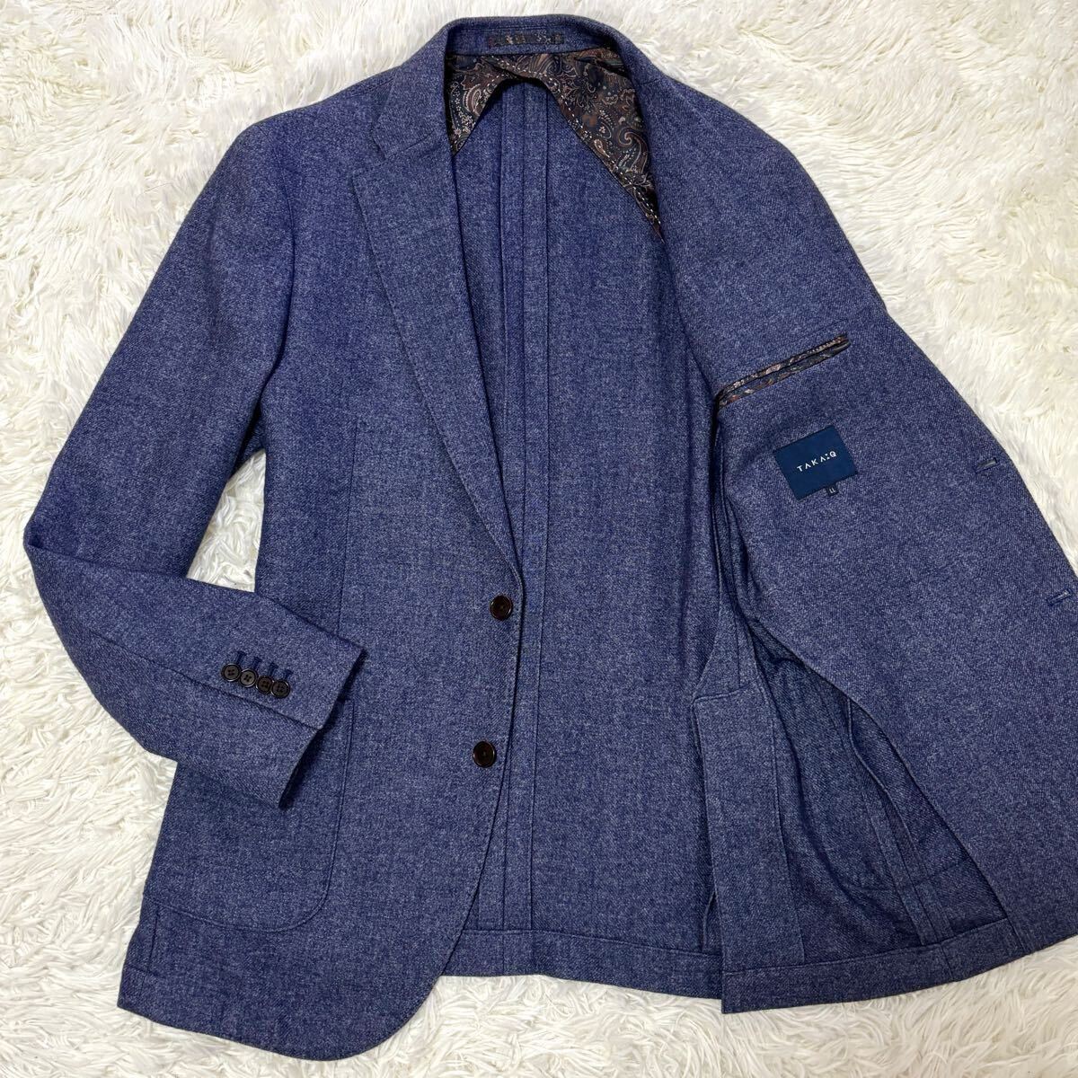 > 【未使用級】XLサイズ ツイード イタリア生地BEL&CO タカキュー テーラードジャケット ペイズリー 極暖起毛 ネイビーブルー青 LL TAKA:Q
