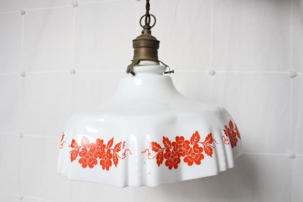 - フランス アンティーク 古いミルクガラスのランプシェード オレンジ色の花模様 専用のコード&ソケット付き 実働 美品