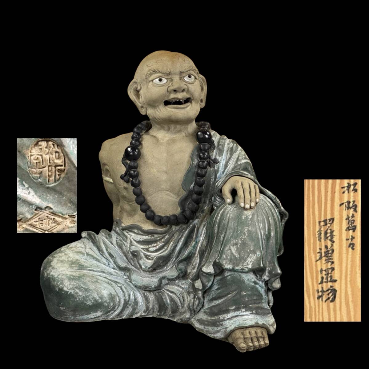 > 【偲】松阪萬古 古松 羅漢 置物 胴銘 仏像 高さ約27.5㌢ 幅約31㌢ 飾り物 焼き物 陶器 東洋 美術品 r-213