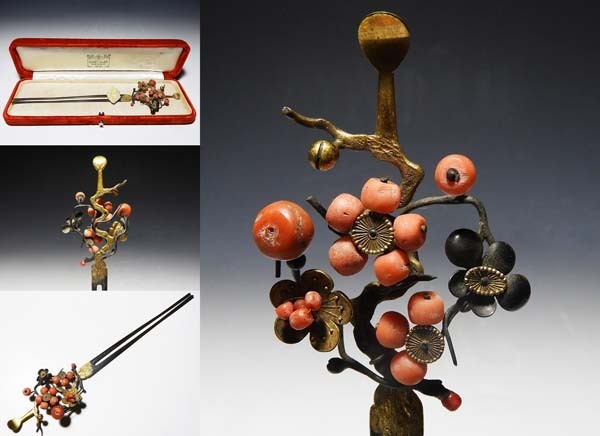 - 【桃】アンティーク髪飾り:金工純銀地鍍金に珊瑚梅の図簪