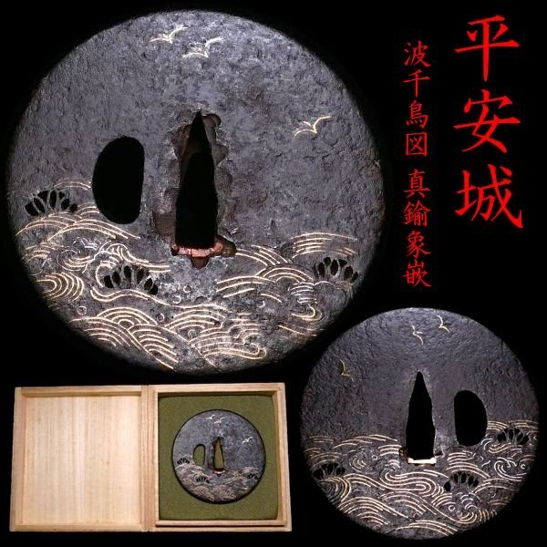 - 【 恵 #1882 】 平安城の優品 「波千鳥」の図 真鍮象嵌 鉄地鍔 煌びやかで見栄え良き一品です 検:鍔/縁頭/刀剣/刀装具