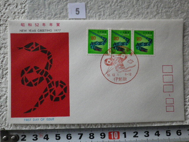 - FDC 年賀 竹へび 1977年 3貼1消 解説書有 郵便切手普及協会●5●