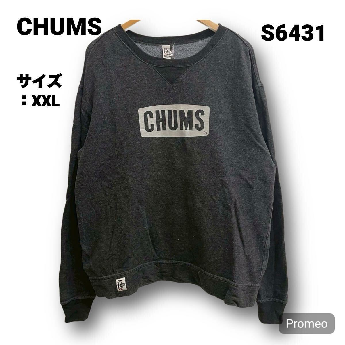 > 【S6431】 CHUMS チャムス スウェット トレーナー 前V サイズXXL ブラック 黒 フロントロゴ プリントロゴ メンズ トップス 最落なし 古着